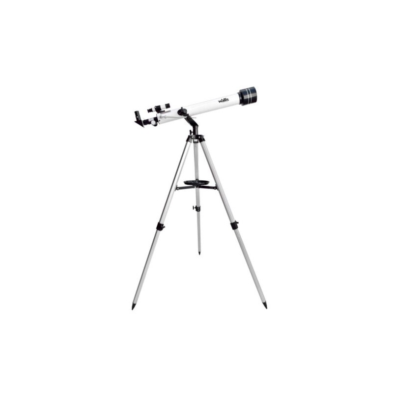 El telescopio refractor Wallis utiliza un lente convexo (lente objetivo) en la entrada de luz del tubo, que refracta los rayos de luz concentrandolos y alineandolos hacia el final del tubo, donde se encuentra la salida ocular (Situada en el fondo del telescopio), que es el lugar donde colocamos los lentes oculares. Tiene montura altimuzal, montura basica que permite movimiento de altitud (arriba-abajo) y movimiento circular Horizontal (izquierda-derecha). Este tipo de montura requiere practica para poder dominarla.