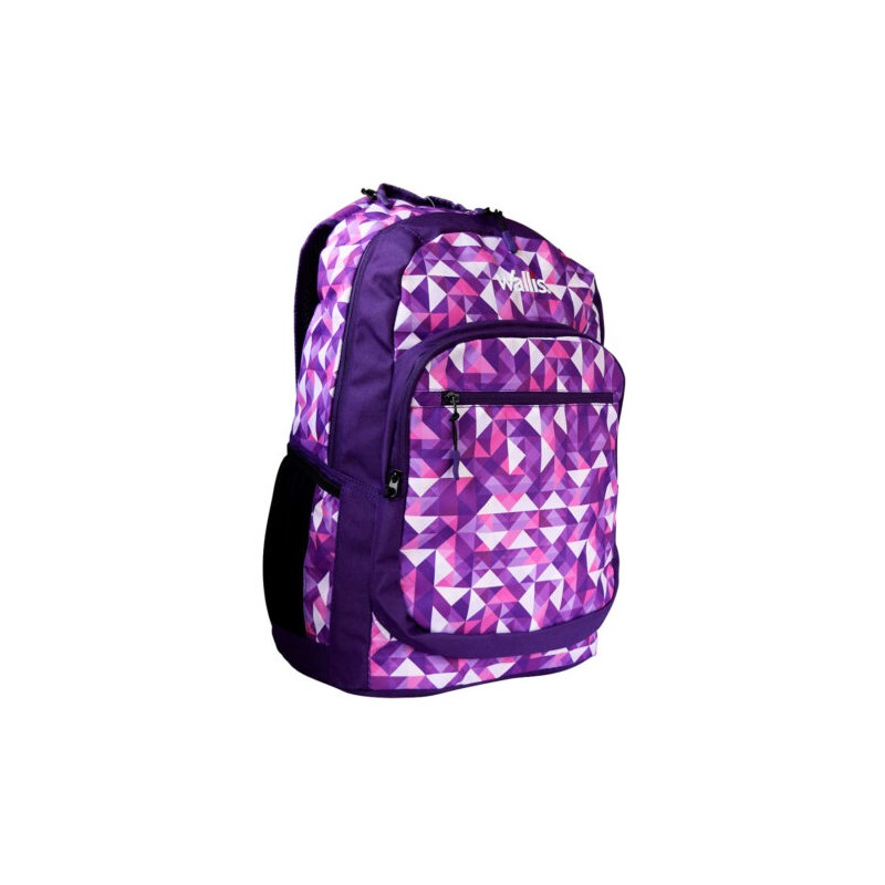 .Mochila semi-impermeable triangulos morado con rosa.
