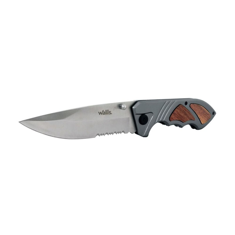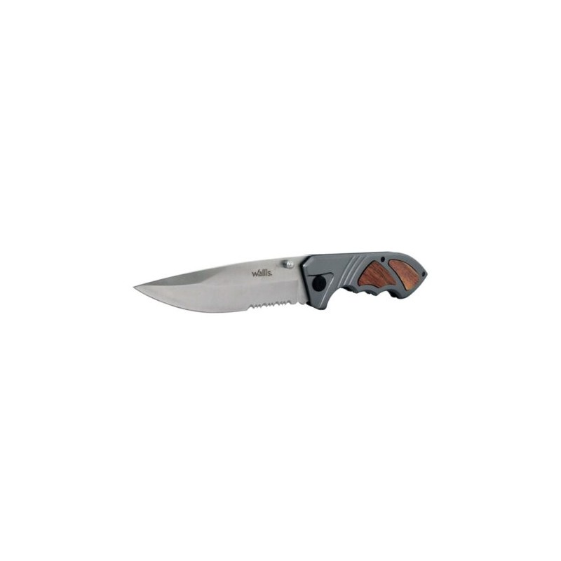 Navaja Wallis de bloqueo,Hoja Liso con Sierra, mangoHecho conumetal tipo madera y clip para que la lleveSicomodamente Ya sea enla cintura o en tu ves lamenta. Bloqueo de manual con tornillo de apoyo.